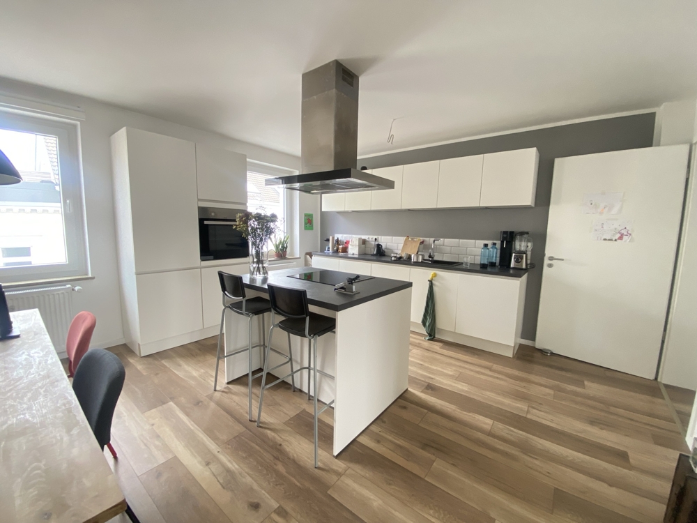 Helle, große Wohnküche mit Kochinsel und modernen Einbaumöbeln.