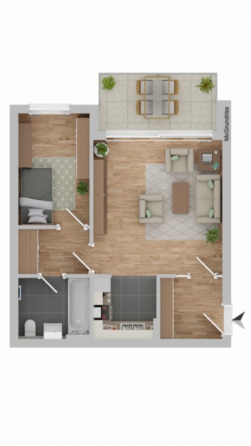 Alle Wohnräume sind mit einem pflegeleichten, hellbraunen Vinylboden in Eichenoptik ausgestattet, der eine freundliche und moderne Wohnatmosphäre schafft. Das Badezimmer verfügt über dunkle Bodenfliesen und hellbraune Wandfliesen und ist mit einer Badewanne ausgestattet. In der offenen Küche wurde ein robuster PVC-Boden verlegt; die vorhandene Küchenzeile inklusive Elektrogeräten (Herd, Backofen, Spüle) steht zur Nutzung bereit. Das Wohnzimmer bietet einen direkten Zugang zum großen Balkon.