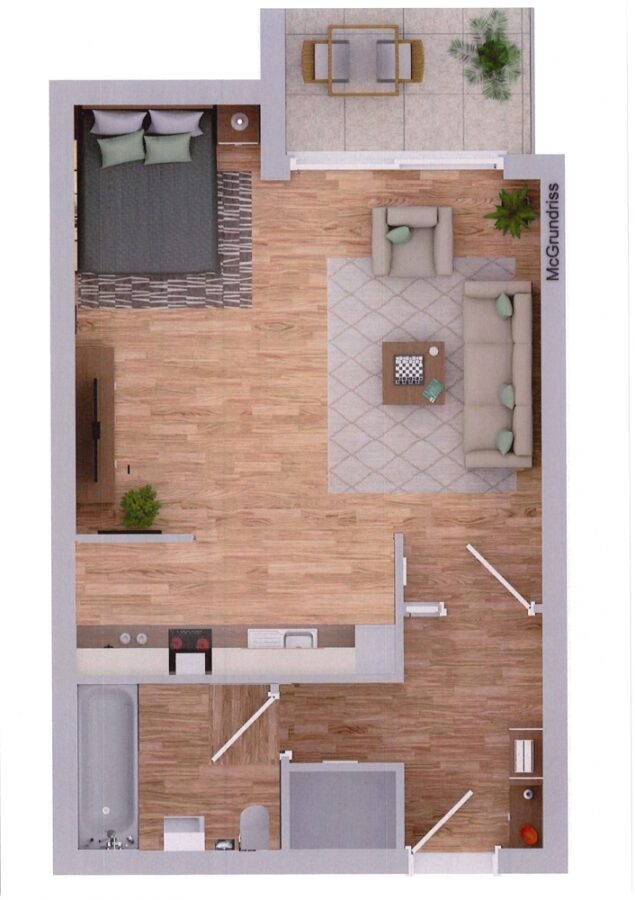 Modernes 1-Zimmer-Apartment mit Balkon, Einbauküche und Stellplatz.